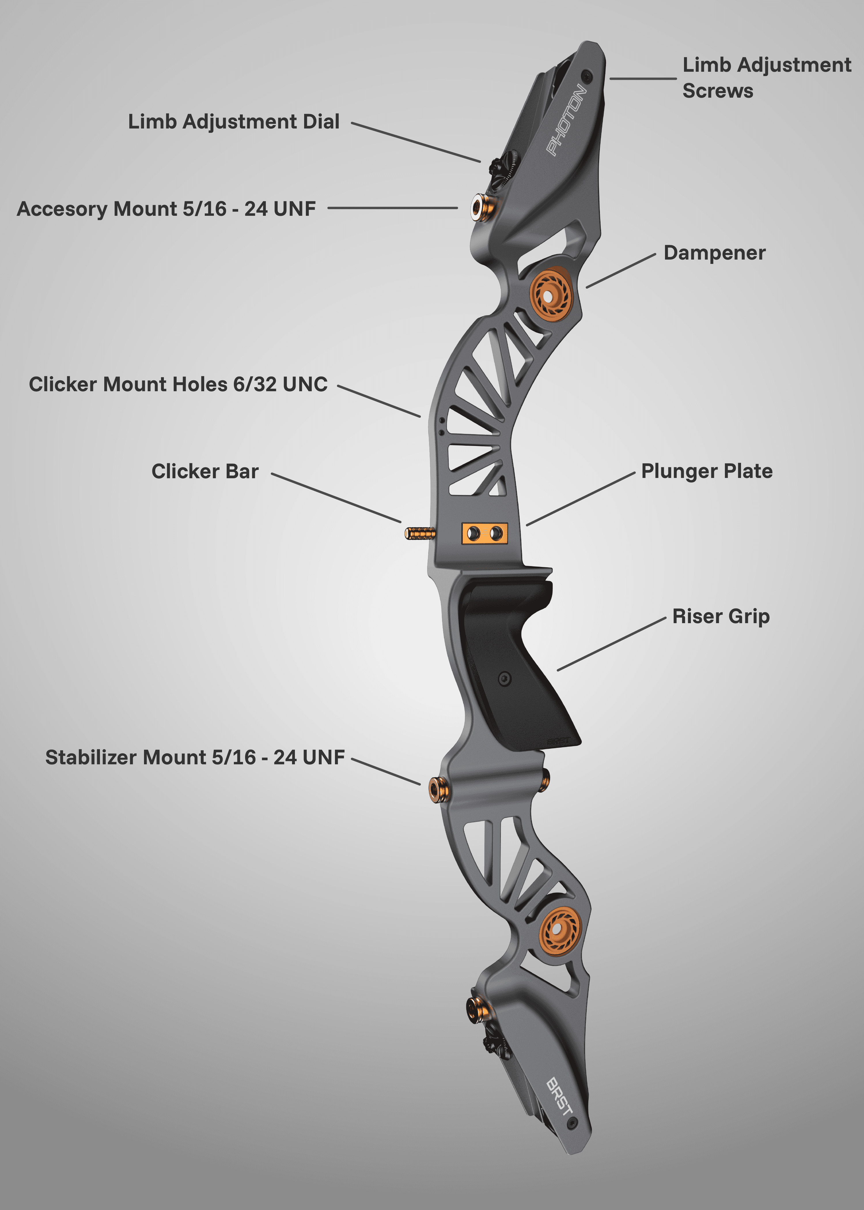Photon BRST is a recurve archery riser that celebrates the unique qualities that every archer brings to the bow. By highlighting the touch points for customization, Photon BRST stands out even after an archer has added all of their accessories.