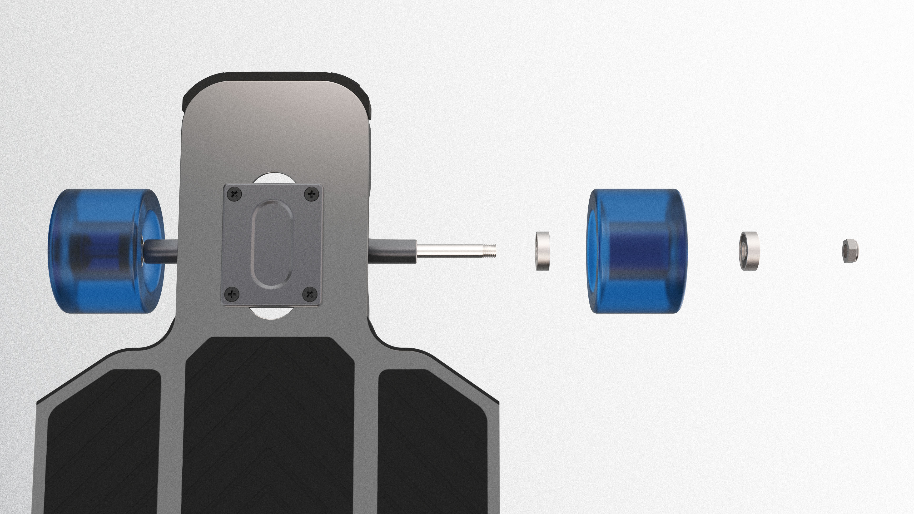 The deck, wheels, bearings, trucks, and bolts are all interchangeable with standard longboarding hardware.